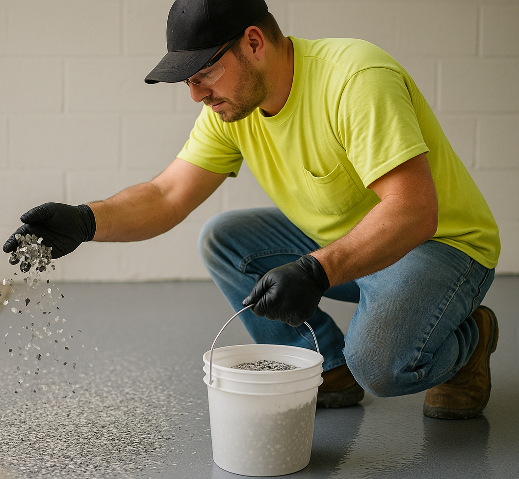 While the base coat is still wet, we apply your chosen color flakes to add style and dimension, ensuring even distribution and removing access